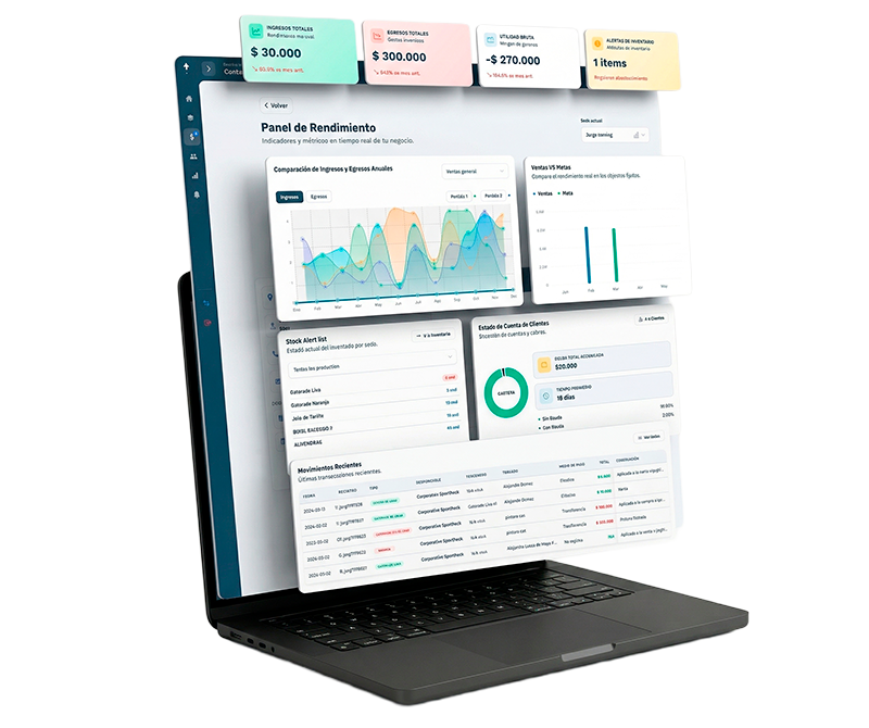 - Panel financiero interactivo con conciliación bancaria.
